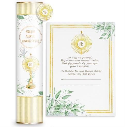 Tuba Komunijna, wysokość 25cm,średnica 5 cm. Bogato złocona, zamykana stalowymi złotymi wieczkami. W komplecie kartka z życzeniami A4 z obwolutą i bilecikiem. Całość zapakowana w worek foliowy z wstążką i przywieszką. prečítať celé