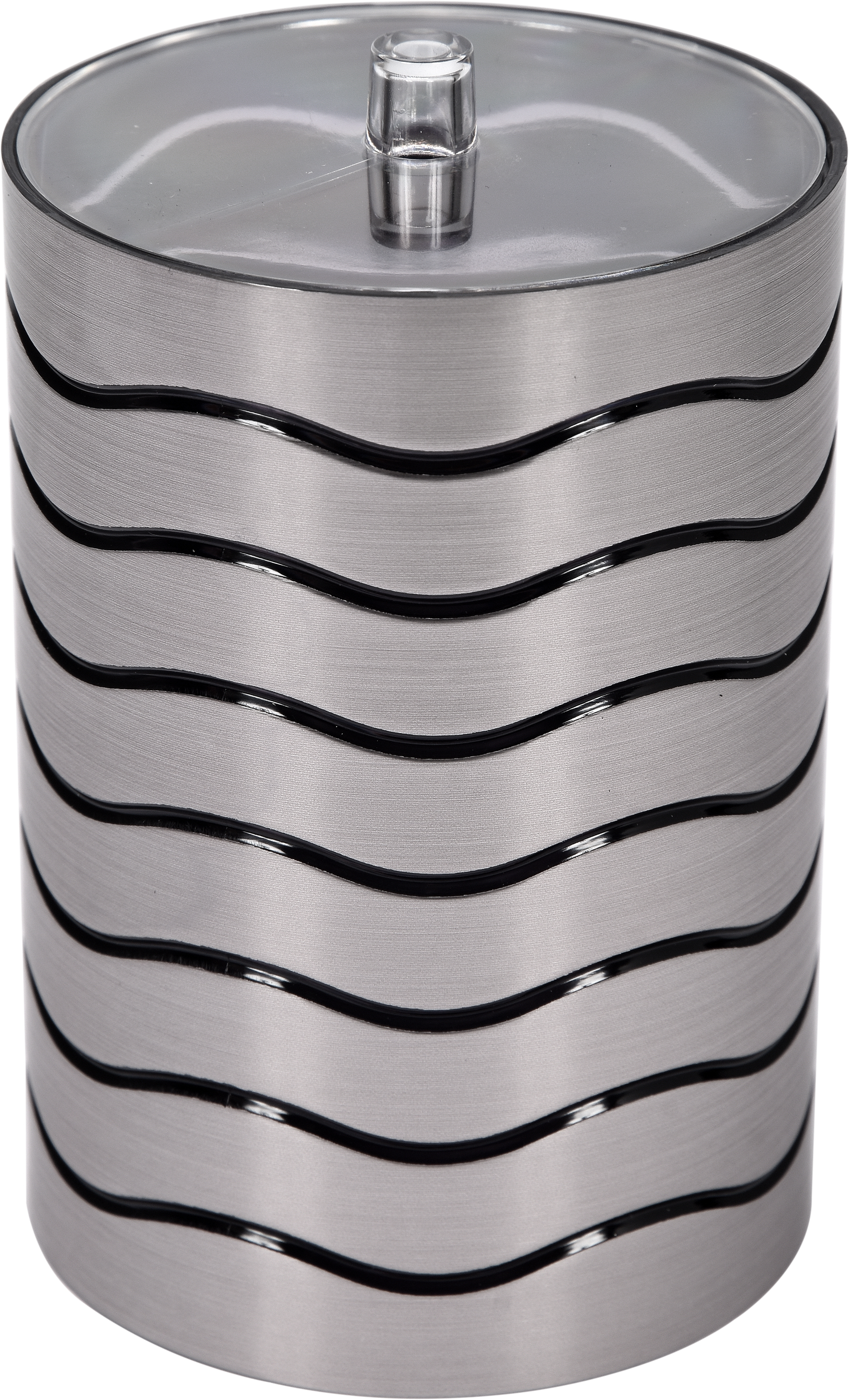 Kelímek s víčkem s průměrem 7 cm a výškou 10,5 cm. Vyrobeno z odolného plastu s ocelovým, niklovaným povrchem. Řada Wave se díky minimalistickému designu hodí úplně všude v interiéru. prečítať celé