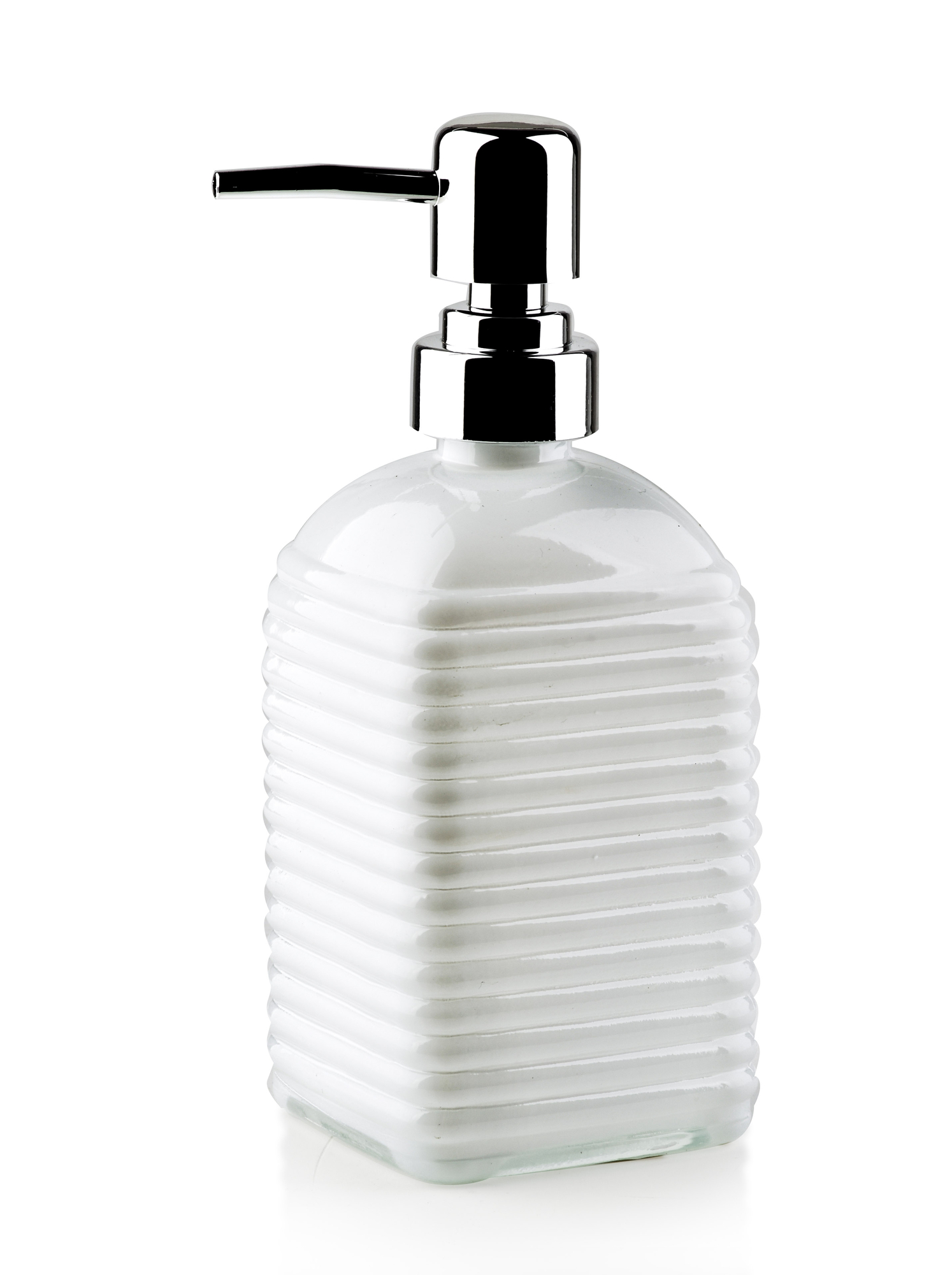 Szklany dozownik z serii KYLE marki BATHLAB by MONDEX. Posiada srebrną pompkę która ułatwia wydobycie się mydła na zewnątrz. Dozownik na mydło w płynie KYLEcechuje się dokładnym wykonaniem. Idealny biały matowy pojemnik w poziome tłoczone paski....