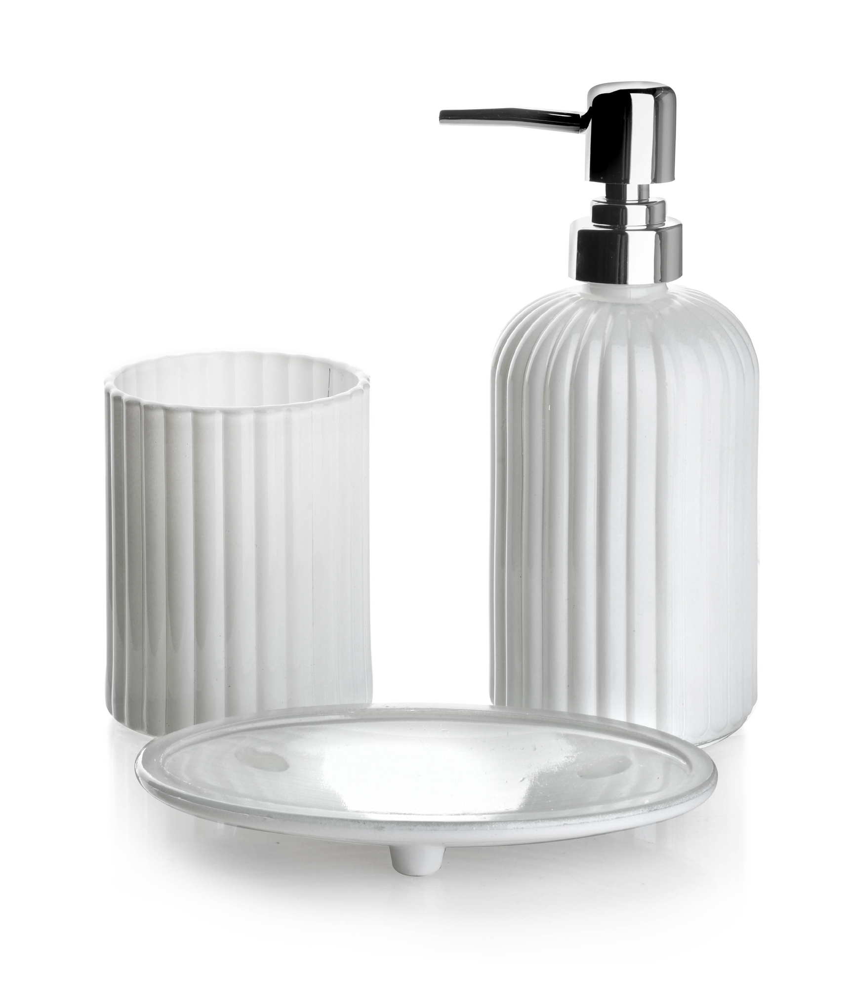 Szklany komplet łazienkowy 3-elementowy z serii ARI marki BATHLAB by MONDEX.Zestaw wykonany jest ze szkła, składa się z mydelniczki, szklanego kubka na szczoteczki do zębów oraz dozownika na mydło z pompką z tworzywa sztucznego.Ari wprowadzi do Waszej łazienki odrobinę wyrafinowania, które...