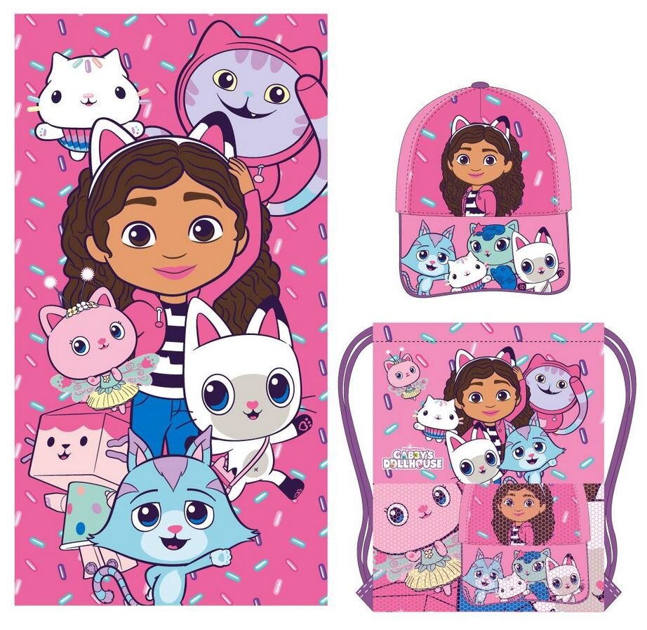 Ručník - osuška s kšiltovkou a pytlíkem Gabby's Dollhouse|Gábinin kouzelný domek: Gábi s kočkami (70 x 140 cm)
