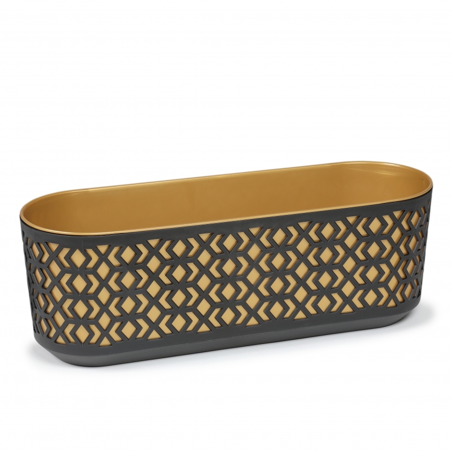 LAMELA, truhlík AZTEK 600 mm, zlatý Moderní plastový oválný truhlík AZTEK bude ozdobou každé domácnosti, podtrhne krásu vašich květin a oživí interiér. Truhlík se skládá ze dvou kusů v krásných kontrastních barvách, děrovaný truhlík - obal (matný) a plný truhlík (lesklý) - vklad. Truhlík (vklad)...