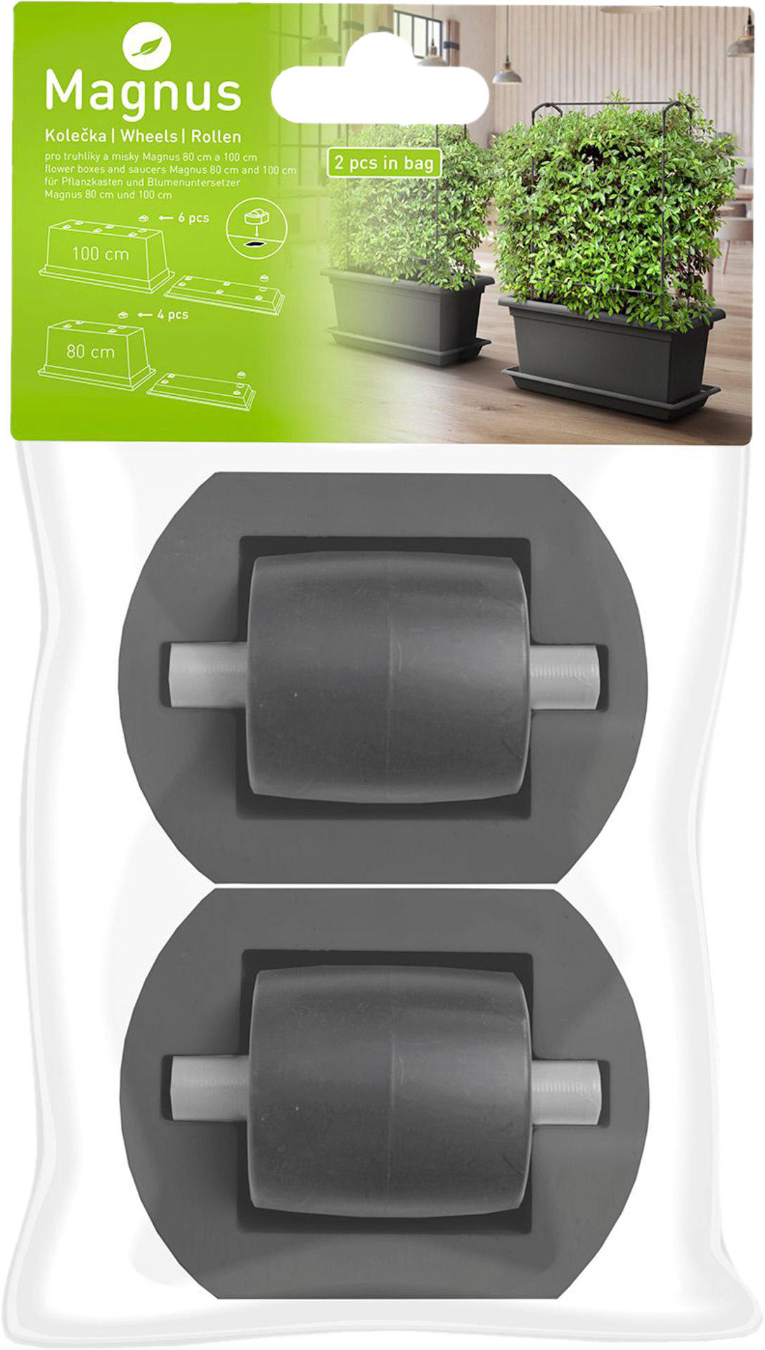 Kolečka jsou již namontovány do vložek. Stačí jen vsunout do předpřipravených otvorů v misce, případně přímo v truhlíku, pokud nepoužíváte misku. Baleno v sadě po 2 ks v sáčku s grafikou a euro závěsem.