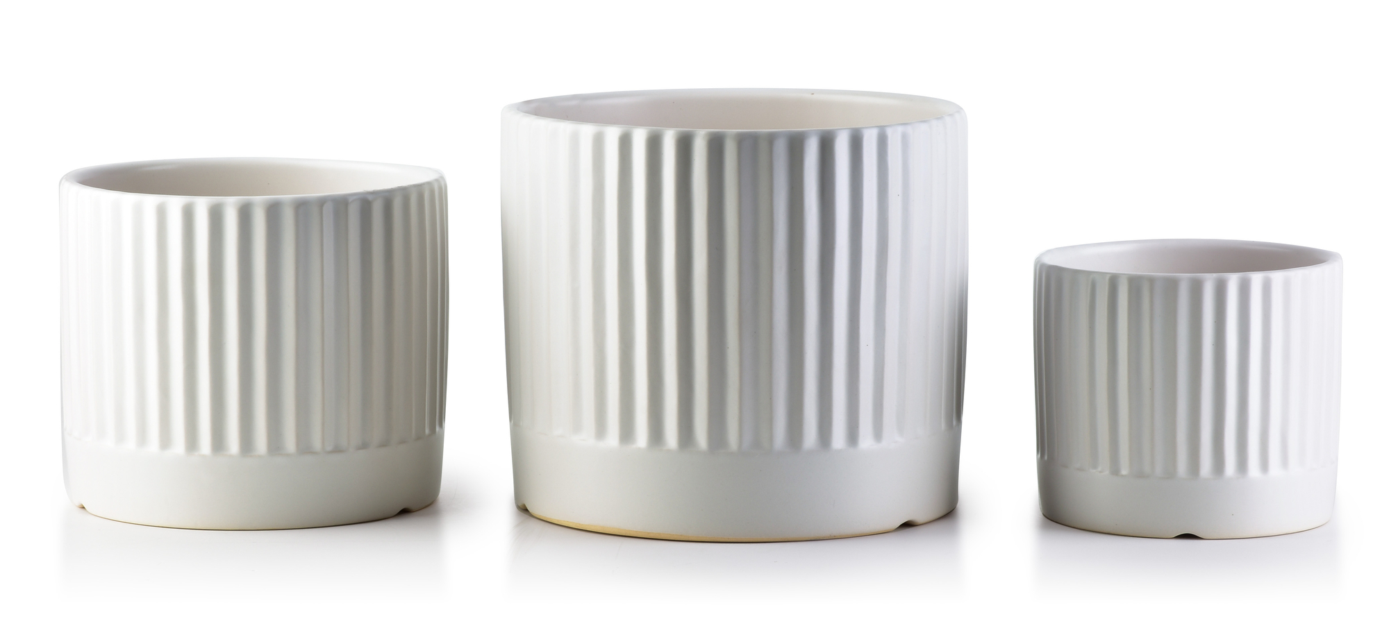 Komplet 3 osłonek z otworem (plus silikonowa zatyczka) z serii NEVA marki MONDEX since 1986r. Dekoracyjna osłonka na doniczkę w kolorze białym matowym w pionowe tłoczone prążki. - wykonana z ceramiki wysokiej jakości...