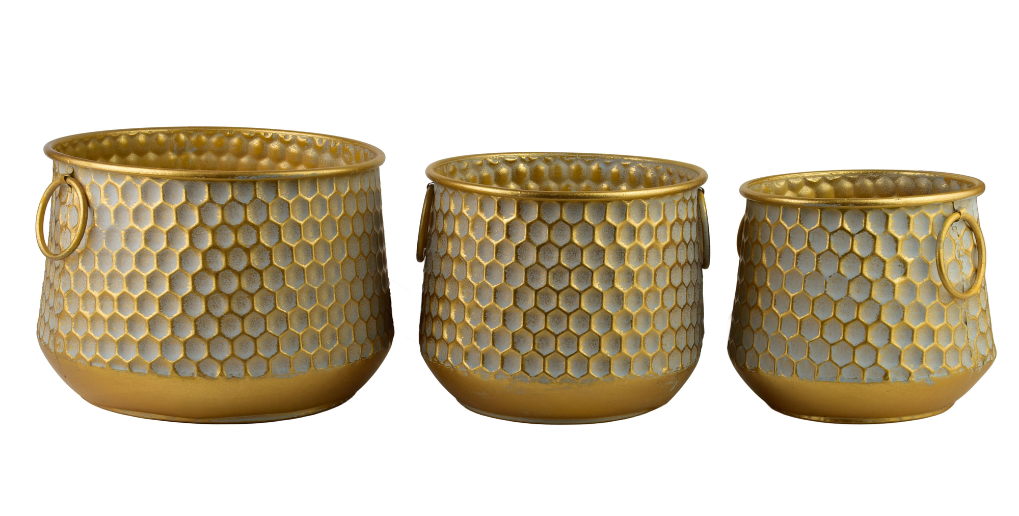 Komplet 3 osłonek HEXAGONE GLOWMateriał: metal Kolor: złoty Forma: sześciokątna (hexagon)Dodatki: praktyczne uchwyty ułatwiające przenoszenieStyl: elegancki, glamour, nowoczesnyZastosowanie: dekoracyjne osłonki na doniczki, ozdoba do salonu, jadalni czy biura.Zestaw HEXAGONE GLOW to wyjątkowa...