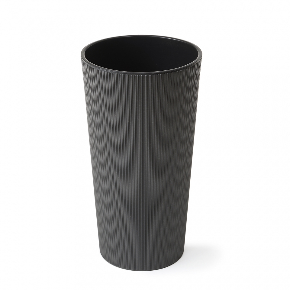 Vysoký plastový květináč z vnější strany zdobený proužkem a matným povrchem, kónického tvaru a s vyjímatelnou černou plastovou vložkou. Do plastové vložky můžete rostliny přímo sadit, pokud do dna této vložky vyvtráte odtokové otvory.