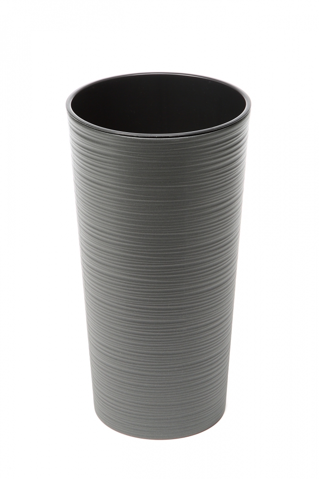 Vysoký plastový květináč vroubkovaný s matným povrchem, kónického tvaru a s vyjímatelnou černou plastovou vložkou. Do plastové vložky můžete rostliny přímo sadit a můžete si také ke květináči koupit zvlášť zamozavlažovací systém díky kterému budete mít zálivku stále pod kontrolou.