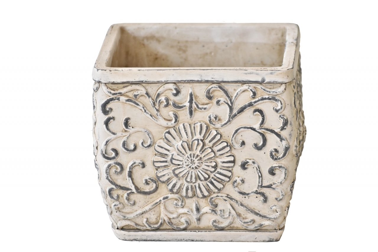 Cementový květináč s orientálním vzorem. Květináč je z kolekce Ornament. Materiál: cementovo-pryskyřičná směs Rozměry: výška 16 cm šířka 18 cm hloubka 18 cm prečítať celé