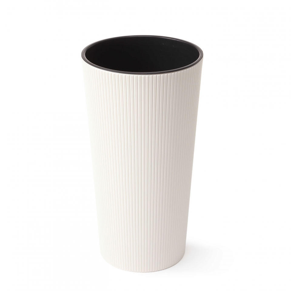 Vysoký plastový květináč z vnější strany zdobený proužkem a matným povrchem, kónického tvaru a s vyjímatelnou černou plastovou vložkou. Do plastové vložky můžete rostliny přímo sadit, pokud do dna této vložky vyvtráte odtokové otvory.