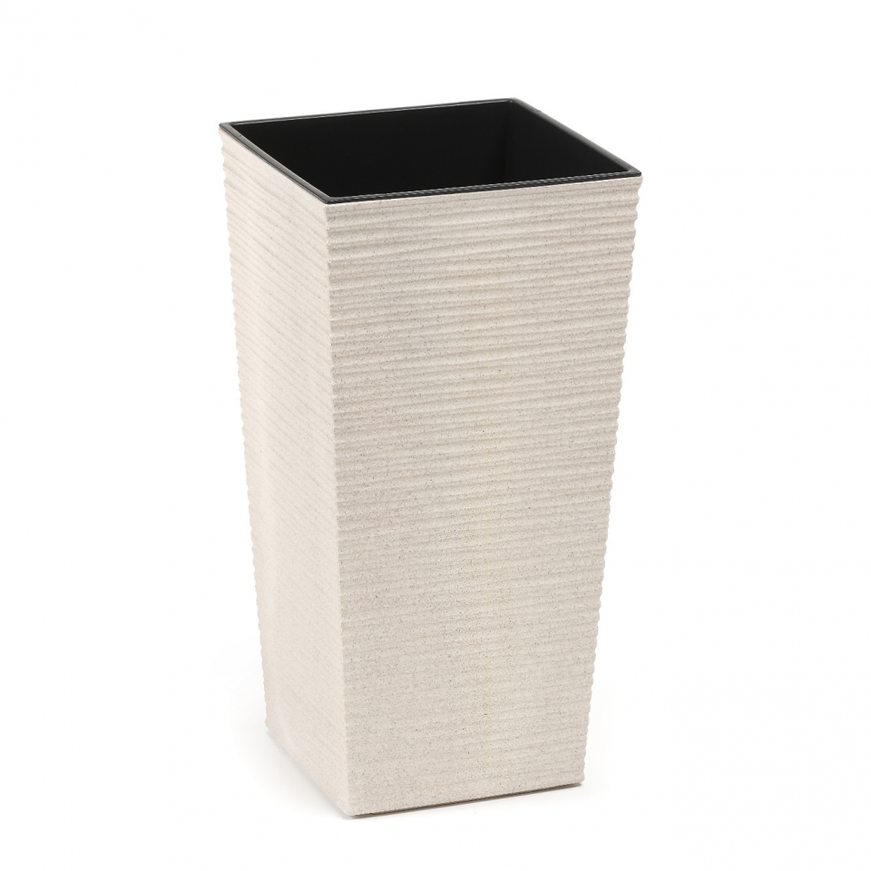 Vysoký plastový květináč vroubkovaný s matným povrchem. Součástí květináče je vyjímatelná plastová vložka černé barvy. Do plastové vložky se rostliny zasadí a plastová vložka se vloží do vnějšího květináče. Květináče jsou vhodné do interiéru a také ven (exteriér).