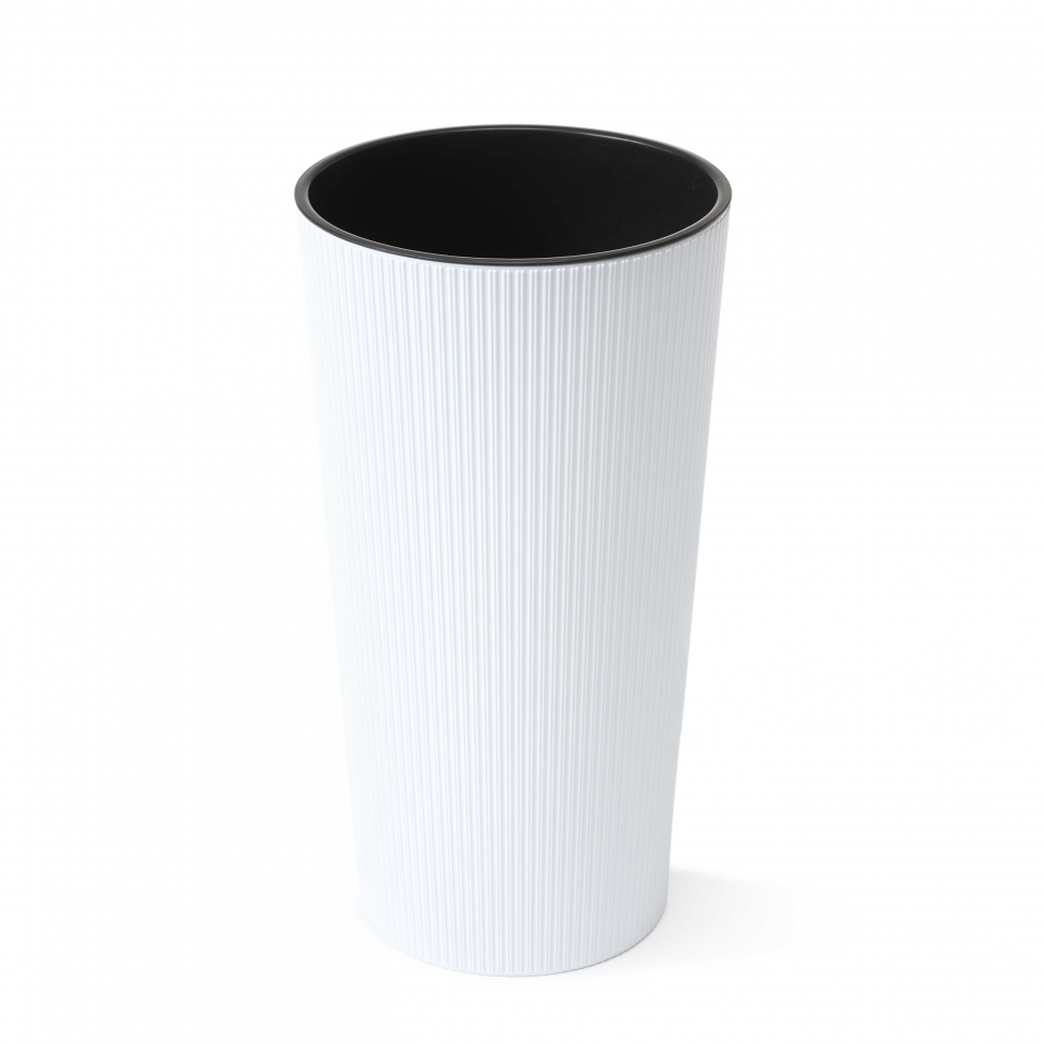 Vysoký plastový květináč z vnější strany zdobený proužkem a matným povrchem, kónického tvaru a s vyjímatelnou černou plastovou vložkou. Do plastové vložky můžete rostliny přímo sadit, pokud do dna této vložky vyvtráte odtokové otvory.