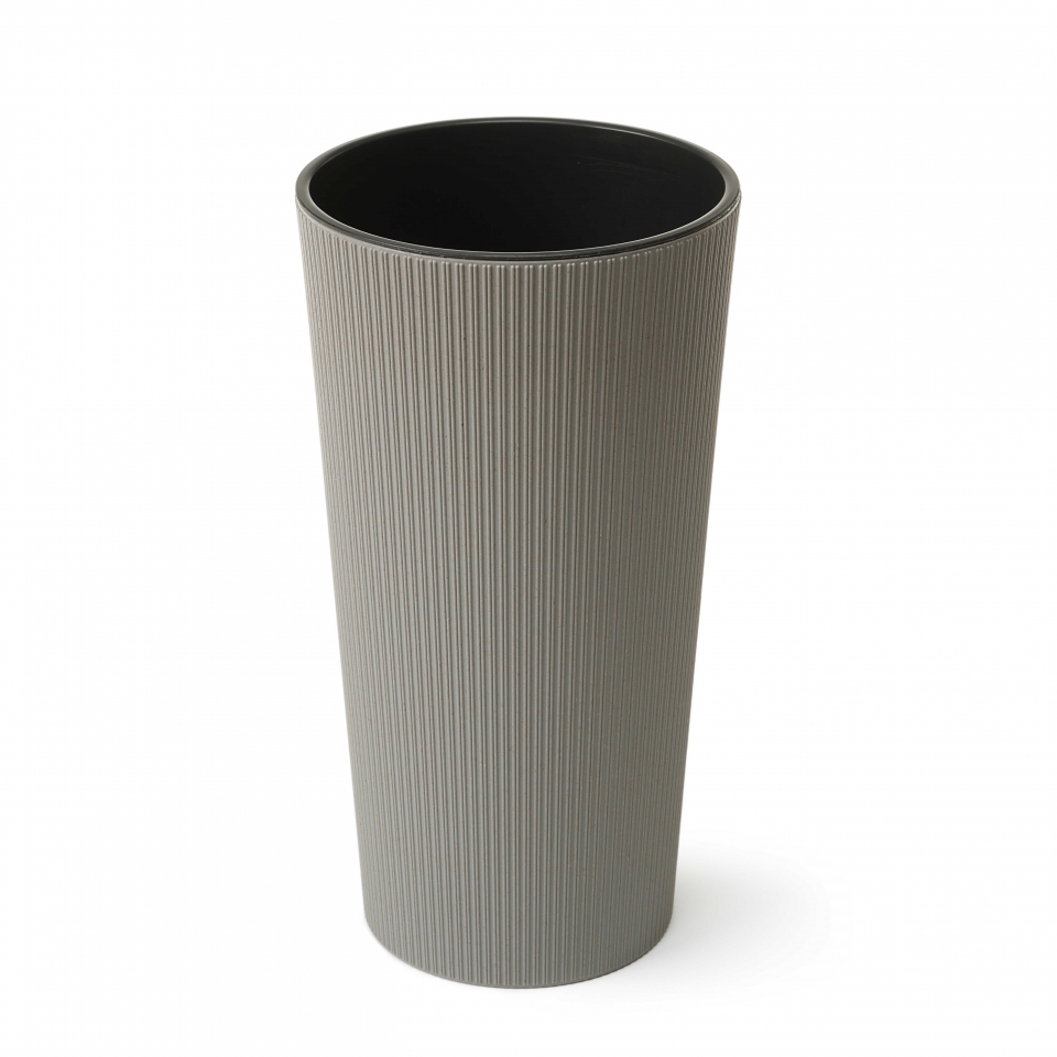 Vysoký plastový květináč z vnější strany zdobený proužkem a matným povrchem, kónického tvaru a s vyjímatelnou černou plastovou vložkou. Do plastové vložky můžete rostliny přímo sadit, pokud do dna této vložky vyvtráte odtokové otvory.