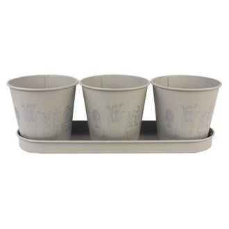 Sada 3 plechových květináčů s tácem. Rozměry květináčů : průměr 11 cm, výška 10,5 cm. Rozměry tácu : 32,5 x 9,8 cm, výška 2,2 cm. Barva : šedá. Materiál : kov. prečítať celé