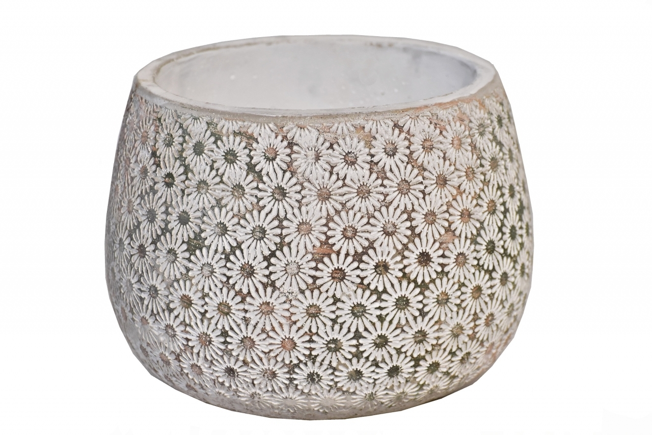 Moderní květináč s reliéfem drobných bílých kopretin na pokojové květiny i do zahrady. Květináče jsou vyrobené z cementovo-pryskyřičné směsi, takže je docela těžký a jen tak se nepřevrátí. Květiníč není mrazuvzdorný.