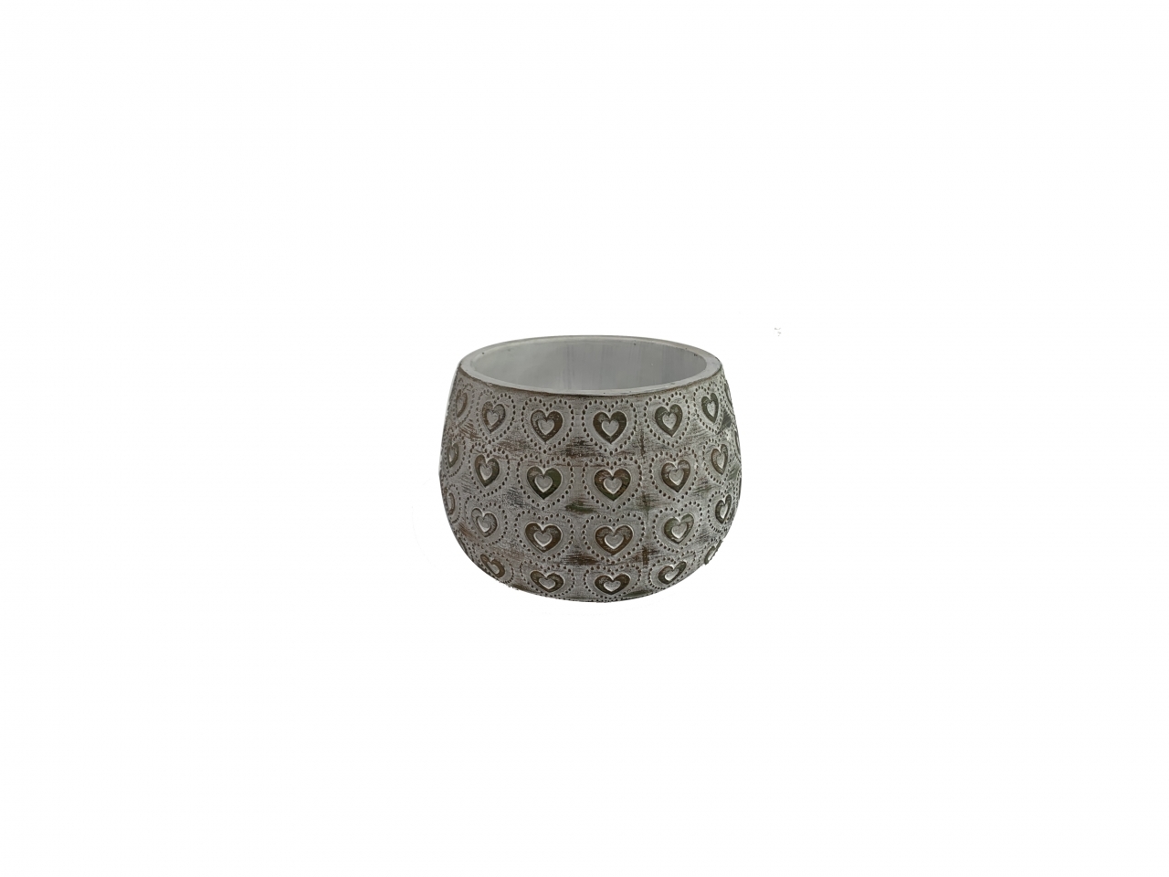 Moderní květináč s reliéfem drobných srdíček. Květináč je vhodný na pokojové květiny i do zahrady. Je vyrobený z cementovo-pryskyřičné směsi, takže je docela těžký a jen tak se nepřevrátí. Květiníč není mrazuvzdorný.