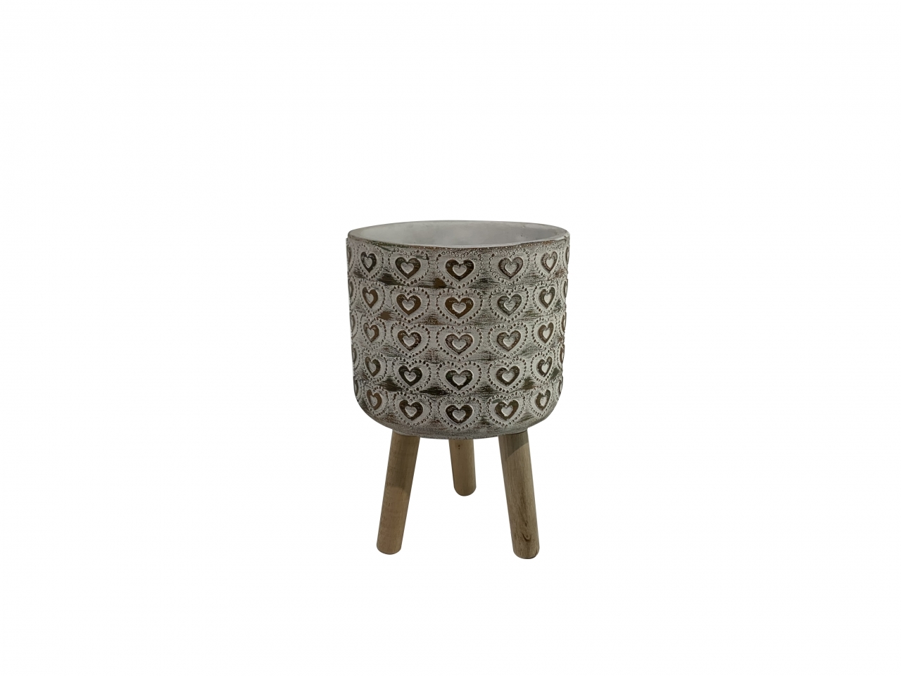Moderní květináč na dřevěných nožkách s reliéfem kopretin. Květináč je vhodný na pokojové květiny i do zahrady. Je vyrobený z cementovo-pryskyřičné směsi, takže je docela těžký a jen tak se nepřevrátí. Květiníč není mrazuvzdorný.