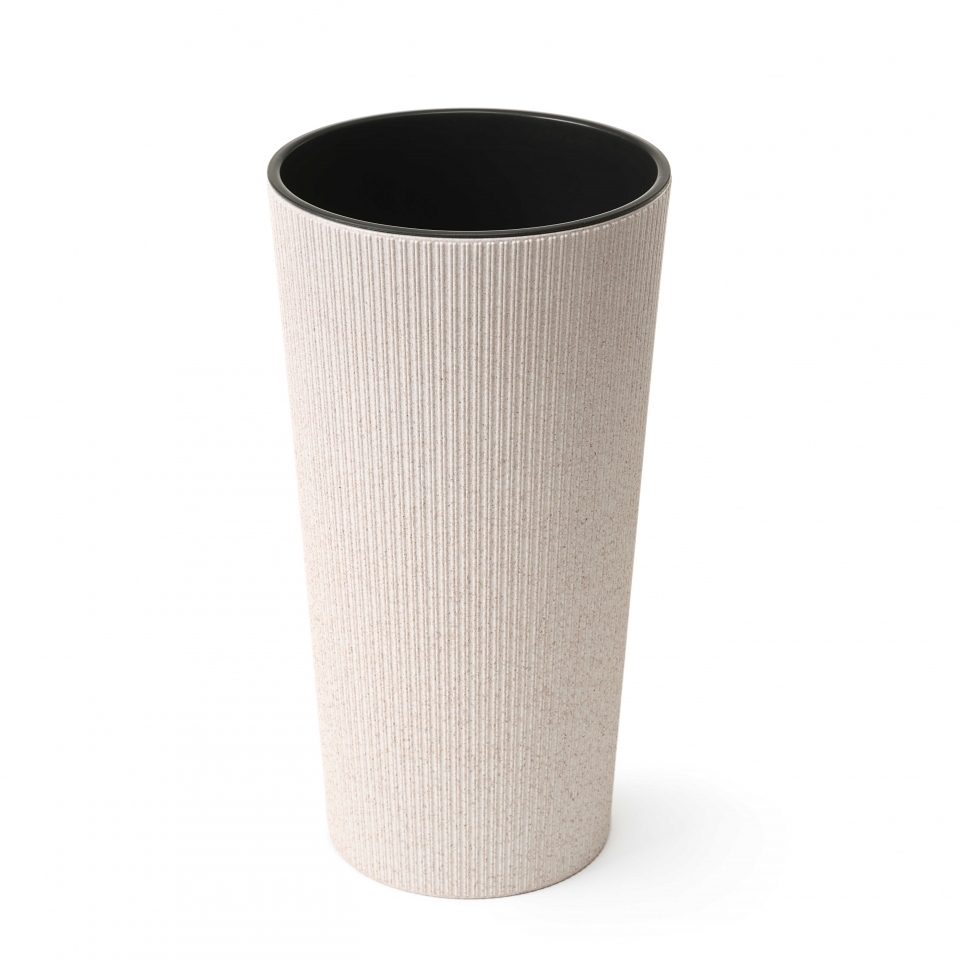 Vysoký plastový květináč z vnější strany zdobený proužkem a matným povrchem, kónického tvaru a s vyjímatelnou černou plastovou vložkou. Do plastové vložky můžete rostliny přímo sadit, pokud do dna této vložky vyvtráte odtokové otvory.