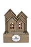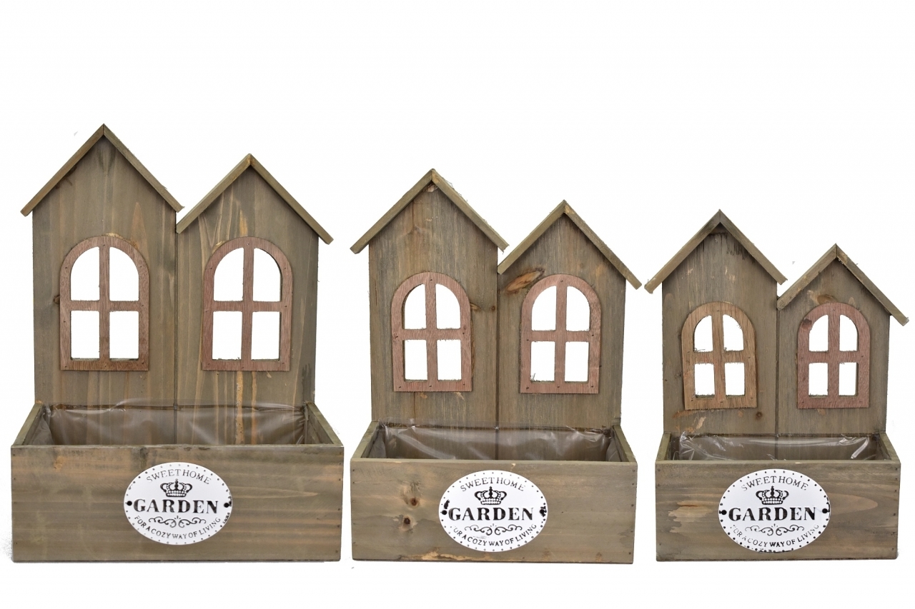 Sada 3 ks dřevěných květináčů s pozadím v podobě domečku. Každý květináč s igelitovou výplní.