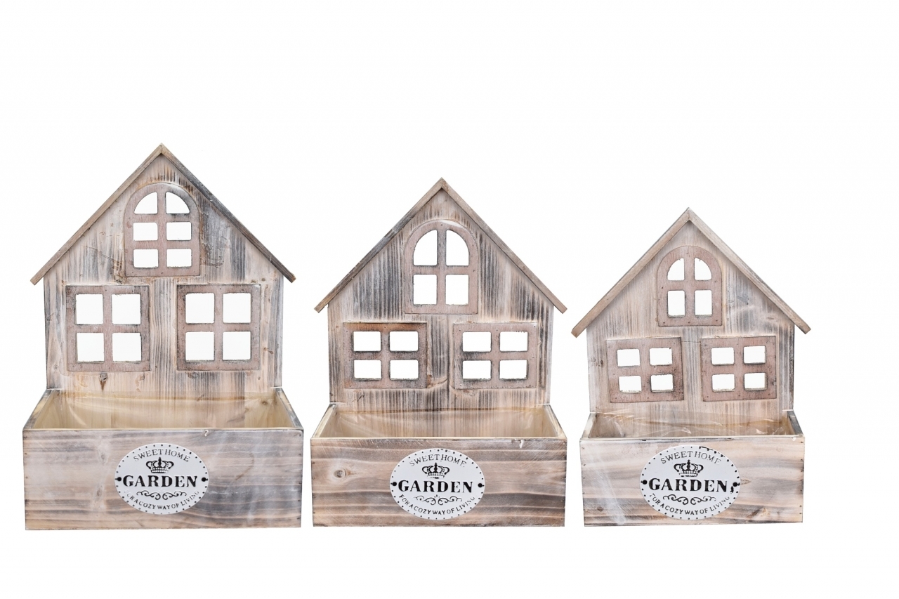 Sada 3 ks dřevěných květináčů s pozadím v podobě domečku. Každý květináč s igelitovou výplní.