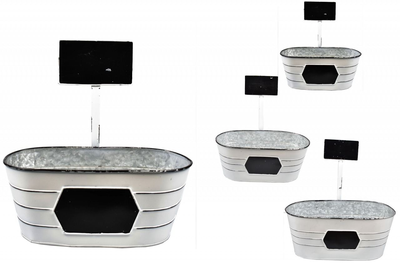 Oválný plechový květináč s popisovací plochou na květináči a zárověň s popisovací plochou na cedulce.Materiál: kovRozměry:velkývýška celkem 36,5 cmvýška květináče 15,5 cmšířka 36,5 cmhloubka 17 cmstřednívýška celkem 32,5 cmvýška květináče 13 cmšířka 32,5 cmhloubka 14 cmmalývýška celkem 28...