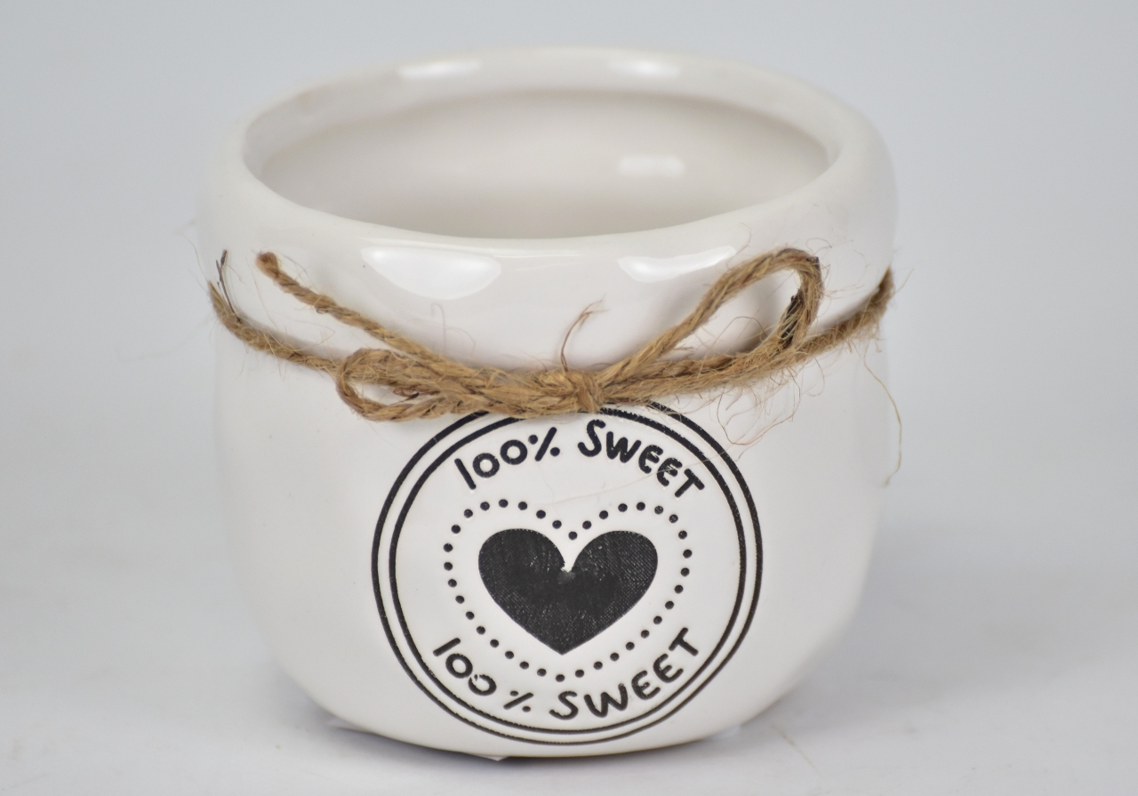 Dejte vašim květinám originální kabát s tímto krásným keramickým květináčem Sweet. Zdobí ho nejen jutový provázek, ale také nápis a srdce, což vytváří dokonalou kombinaci. Tato velikost květináče je ideální pro kaktusy a sukulenty.