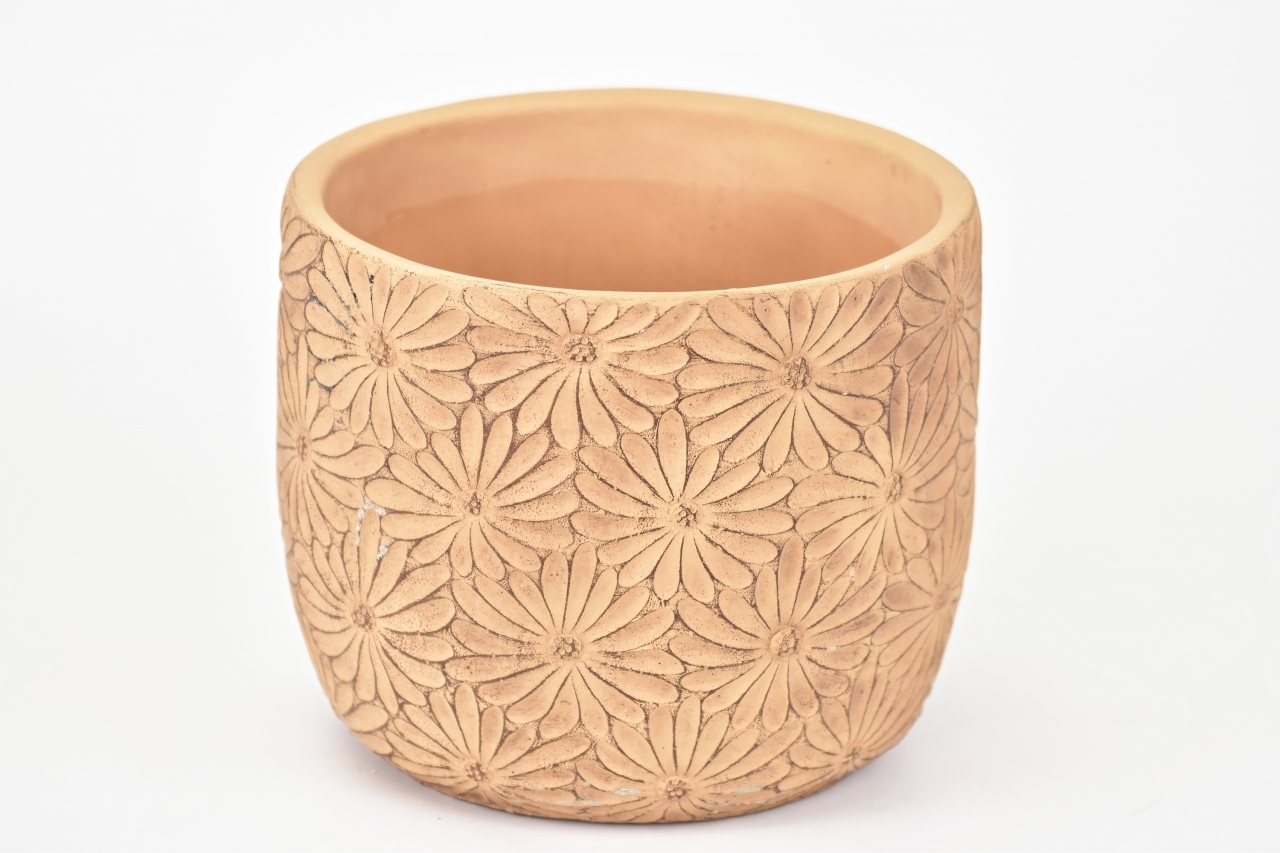 Béžový cementový květináč s květinovým reliéfem. Materiál: cementovo-pryskyřičná směsRozměry:výška 9,8 cmprůměr v horní části 10,7 cm prečítať celé