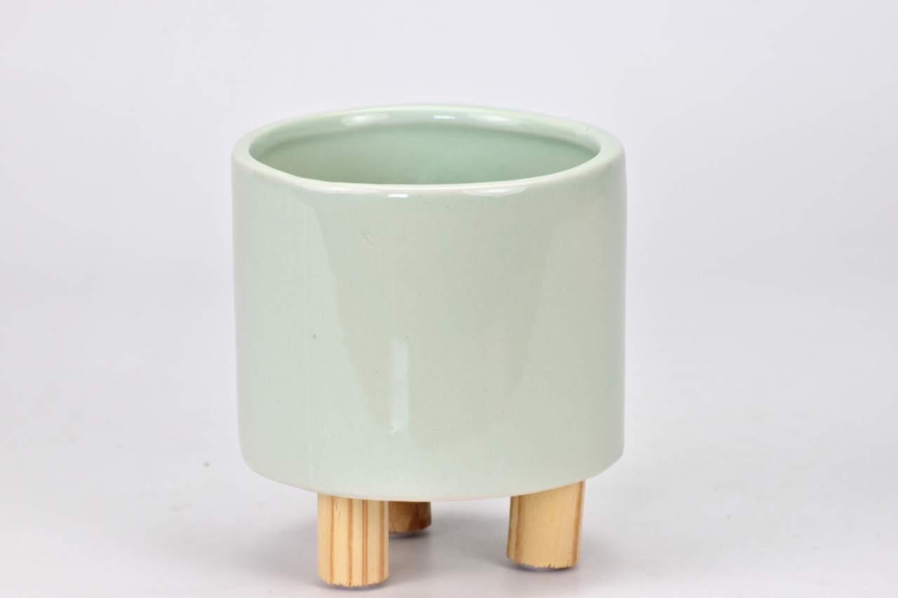 Zelený keramický květináč na dřevěných nožkách. II. jakost z důvodu různých vad v glazuře - nedoglazurované tečky, střečená barva, uštípnutá glazura, hrbolky. Každý květináč má jinou vadu. Tyto vady nejsou důvodem k reklamaci.