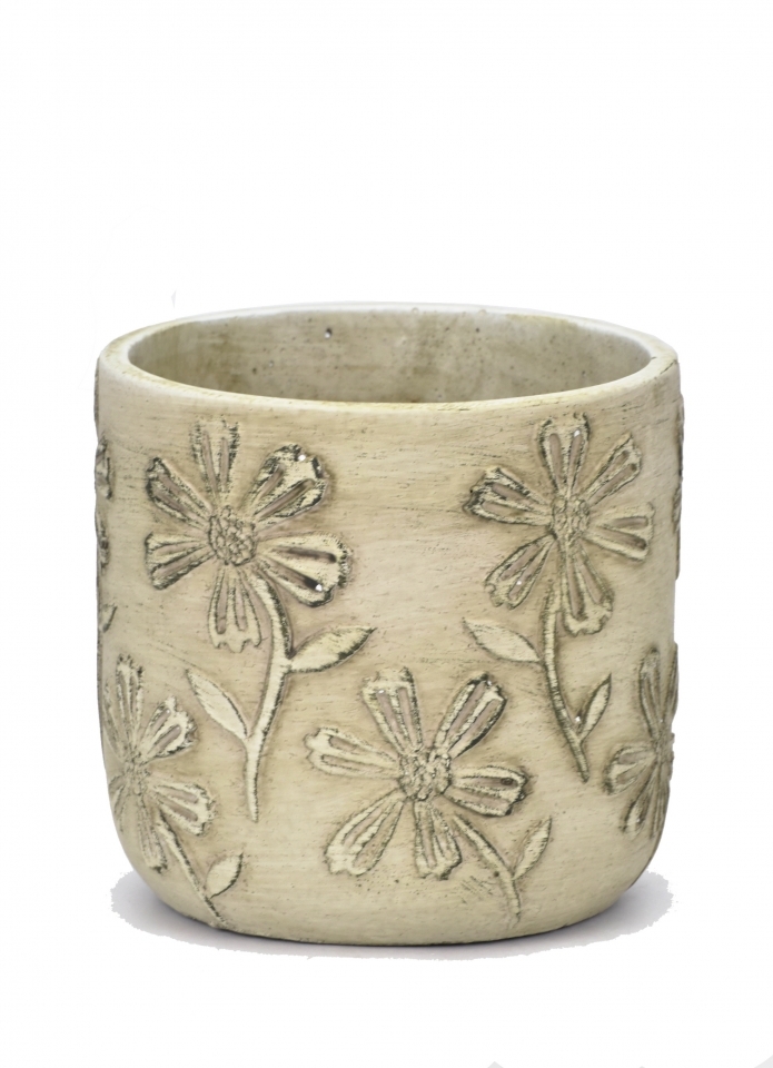 Betonový květináč s reliéfem květin. Dekorace není mrazuvzdorná.Materiál: cementovo-pryskyřičná směsRozměry:výška 14,5 cmprůměr 15 cm prečítať celé