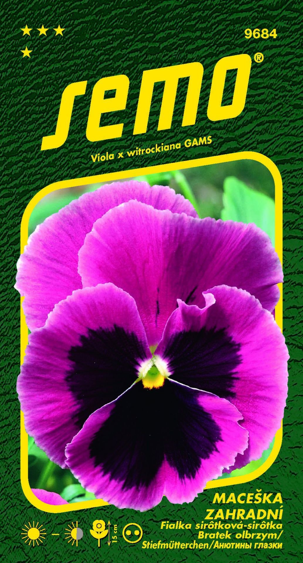 Viola x witrockiana / Sirotka vel´kokvetáPopis:Velké květy růžové barvy s černým okem, výška 15cm. Oblíbená dvouletka používaná pro skupinové záhonové výsadby. Vyhovují ji slunná i mírně zastíněná stanoviště, nesnáší však sucho a úpal. Je citlivá na zaschnutí při klíčení, výsev je nutno...