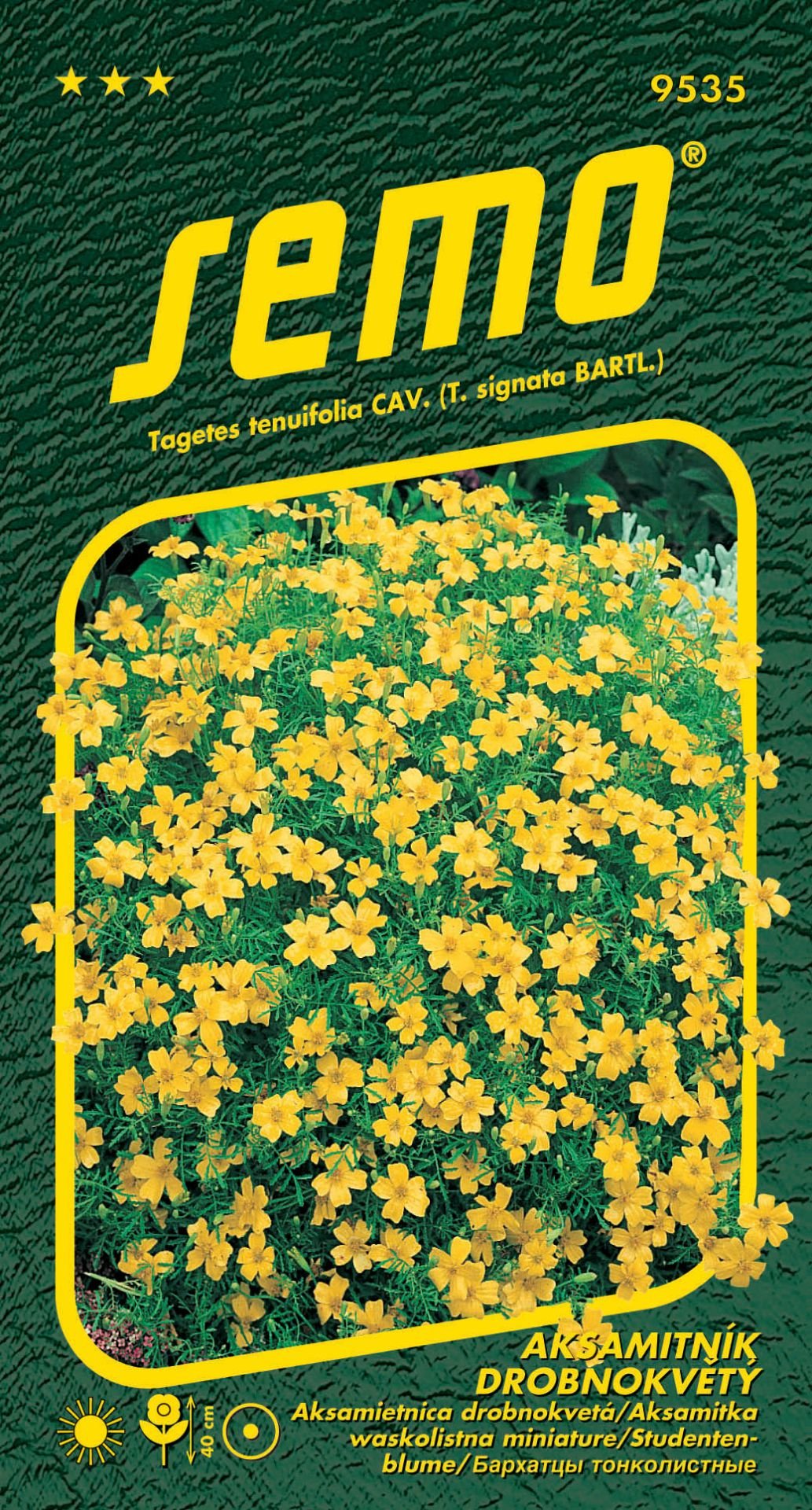 Tagetes tenuifolia Cav. (syn.Tagetes signata Bartl.) / Aksamietnica drobnokvetáODRŮDA: Aksamitník drobnokvětý - žlutý 0,2g (9535)Popis:Letnička s jemně vykrajovanými listy používaná především na záhony a obruby. Lze použít i do truhlíků a nádob. Tvoří nízké, polštářovité rostliny bohatě kvetoucí...