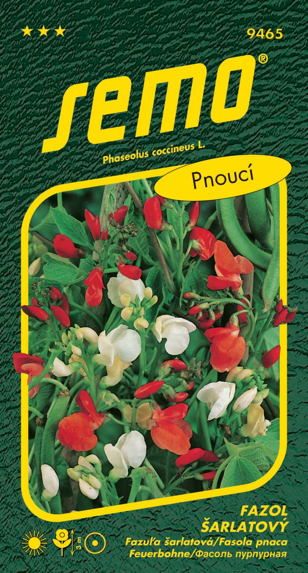 Phasoleus coccineus L. / Fazula šarlatová Popis:Rychle rostoucí popínavá letnička uplatňující se na dočasné živé ploty, k popínání pergol a zídek. Lze ji pěstovat i v truhlících na balkónech. Vyžaduje oporu. Daří se jí na výsluní, na místě chráněném před větrem. Přímý výsev: duben až květen