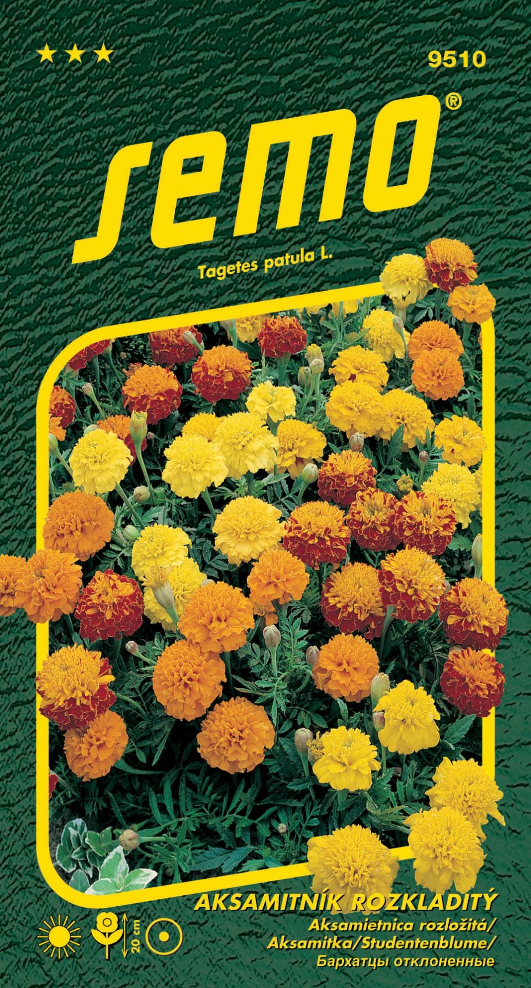 ODRŮDA: Aksamitník rozkladitý - Petit směs 1g (kód 9510)Popis:Bohatě kvetoucí letnička s aromatickými listy určená na záhonové výsadby, obruby, do okenních truhlíků a ozdobných nádob. Nenáročná na pěstování, bohatě kvetoucí po celý rok. Vysazováním aksamitníku kolem citlivých rostlin nebo do skleníků se účinně odpuzují hmyzí škůdci zeleniny. Kořeny obsahují látky potlačující půdní háďátka.Výsev: březen - duben