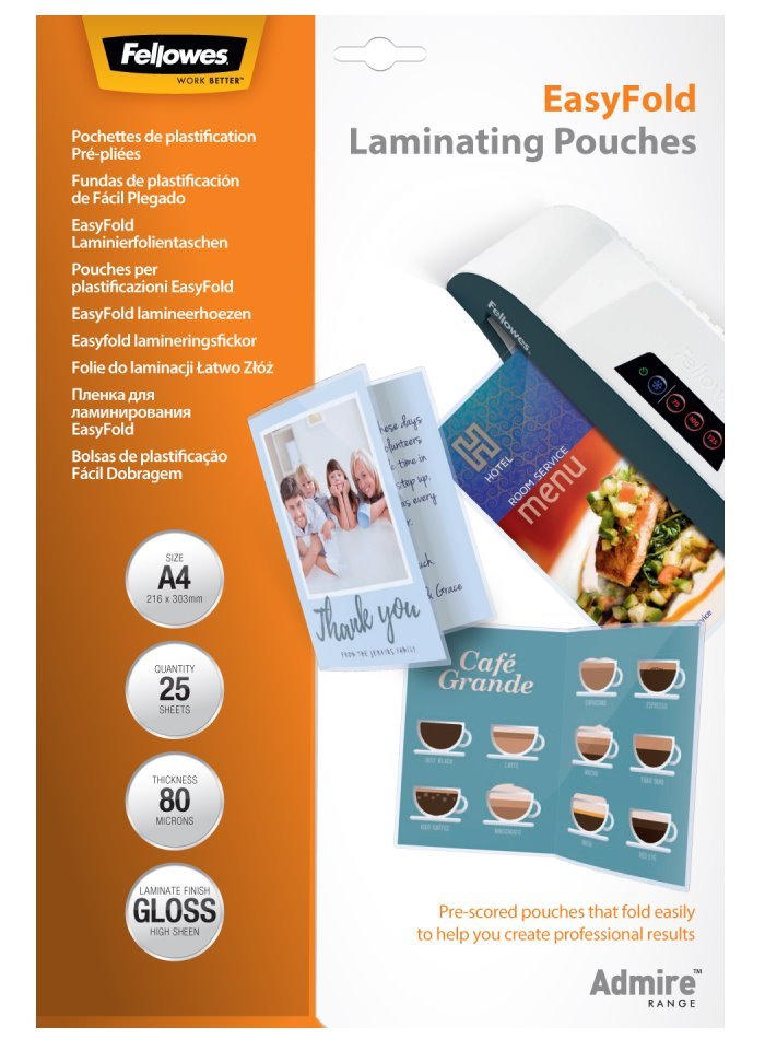 FELLOWES laminovací fólie/ formát A4/ 80 mic/ s rýhou uprostřed pro snadné složení/ lesklé/ 25 pack