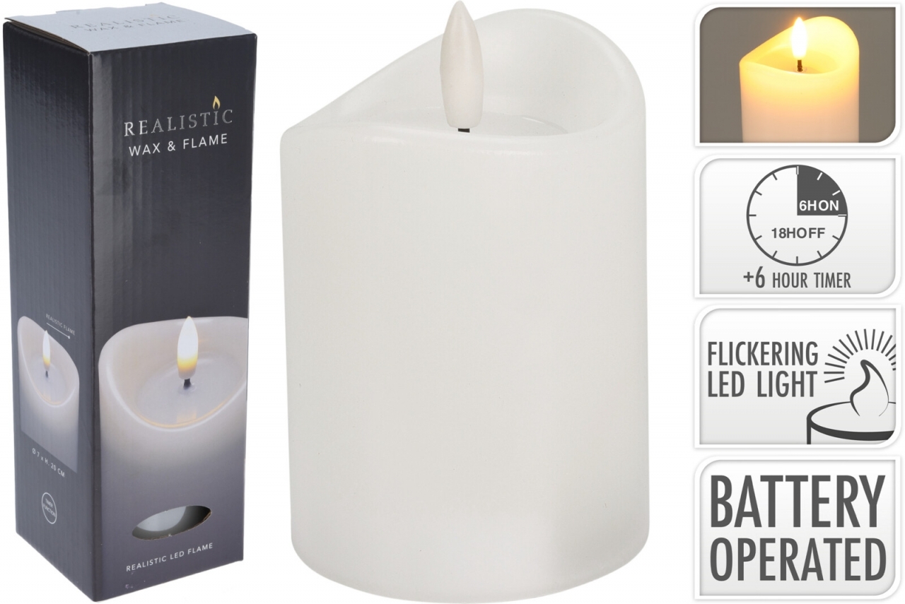 LED svíčka je věrnou imitací pravé svíčky. Umí navodit příjemnou atmosféru na dušičky, Vánoce, ale i v létě na terase. Součástí svíčky je časovač (6 hodin svítí, 8 hodin nesvítí). S blikajícím plamínkem.