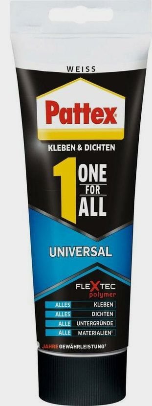 Pattex ONE FOR ALL Universal je jednosložkové flexibilní univerzální montážní lepidlo a tmel pro interiér i exteriér s recepturou FlexTec®. Je určeno k lepení a tmelení většiny savých i nesavých materiálů, jako jsou cihla, keramika, beton, dřevovláknité a dřevotřískové desky, sádrokarton, překližka, přírodní kámen (tloušťka min. 10 mm), MDF, dřevo, kov, tvrzené PVC, polystyren, sklo, plasty, lakované povrchy, zrcadla*.