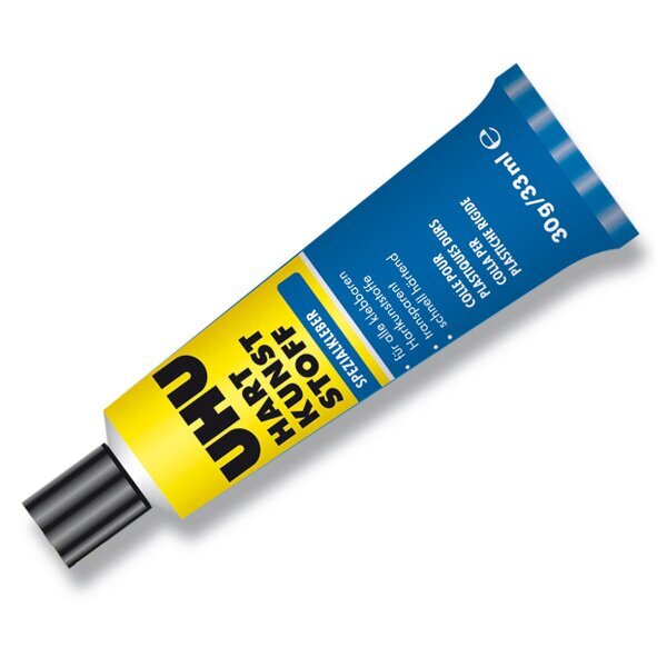 Speciální transparentní lepidlo UHU Hart Kunststoff pro lepení tvrdých plastů. Lepidlo odolává vodě, olejům, ředěným kyselinám a louhům a teplotám od -30 do +90 stupňů Celsia. Tzv. svařování za studena. Lepí plexisklo, tvrdé PVC (novodur) a ABS. I v kombinaci s dalšími materiály.
