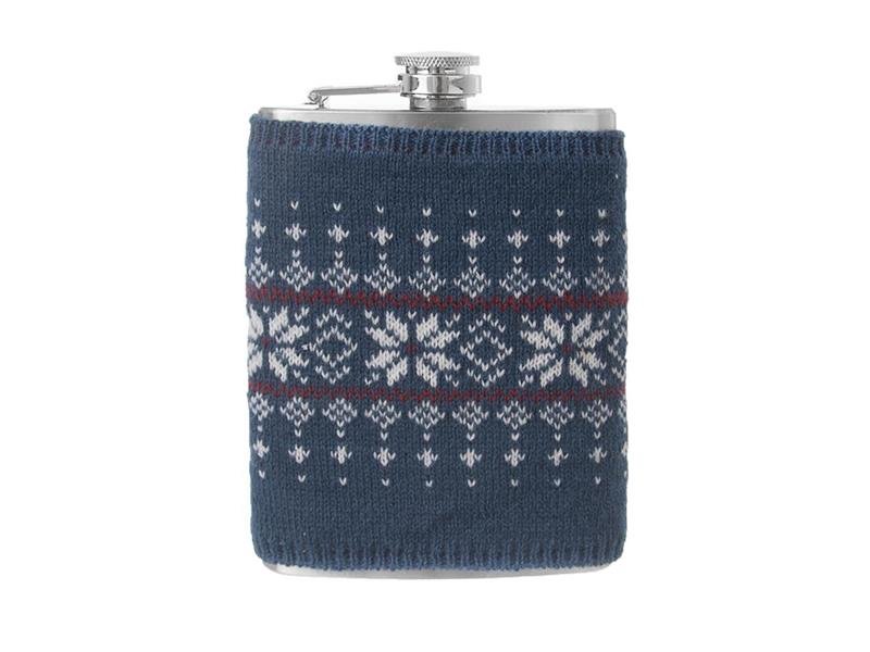 Kapesní lahvička na alkohol – placatka doplněná o pletený svetr se vzorem. Materiál: nerez, akryl. Rozměry: objem 0,24 l, 9,5x2,5x13,5 cm, svetr 10x11 cm. prečítať celé