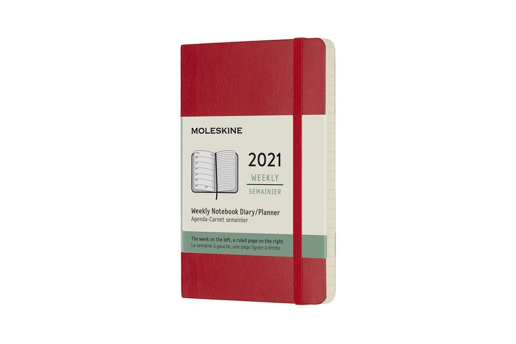 Červený plánovací zápisník kapesní velikosti na rok 2021. Na levé straně jsou dny v týdnu a na pravé linkovaná stránka na poznámky. Zápisník má měkkou, ve hřbetu šitou vazbu. Obepíná ho pružná páska proti samovolnému otevírání. Obsahuje praktickou vnitřní kapsu, textilní záložku a 295 barevných samolepek. Papír s gramáží 70 g/m2 neobsahuje kyseliny.