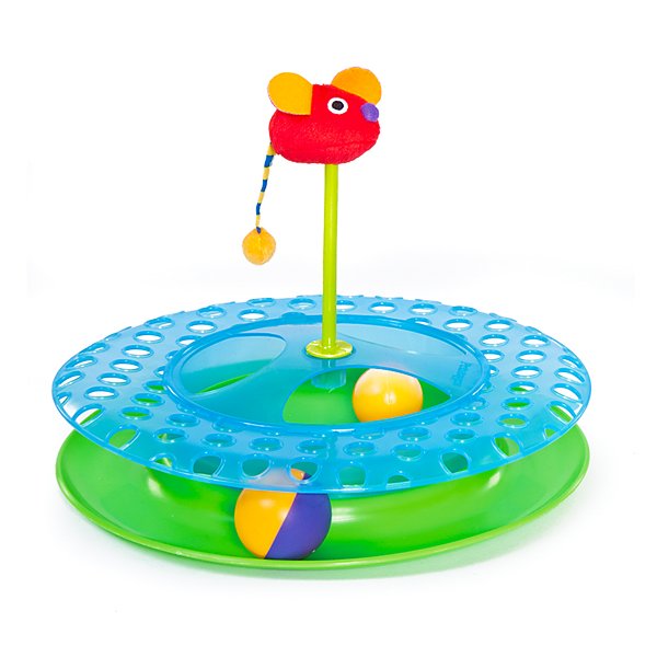 Dopřejte vašim kočkám zábavu v podobě koulodráhy. Dva míčky v jedné hračce, jeden se kutálí po obvodu a druhý je ukrytý uvnitř hry. Kočička může míček postrkovat packou dokola, ale nemůže ho vyndat. Navíc má hračka uprostřed myšku na pružině, která se při hře kýve.