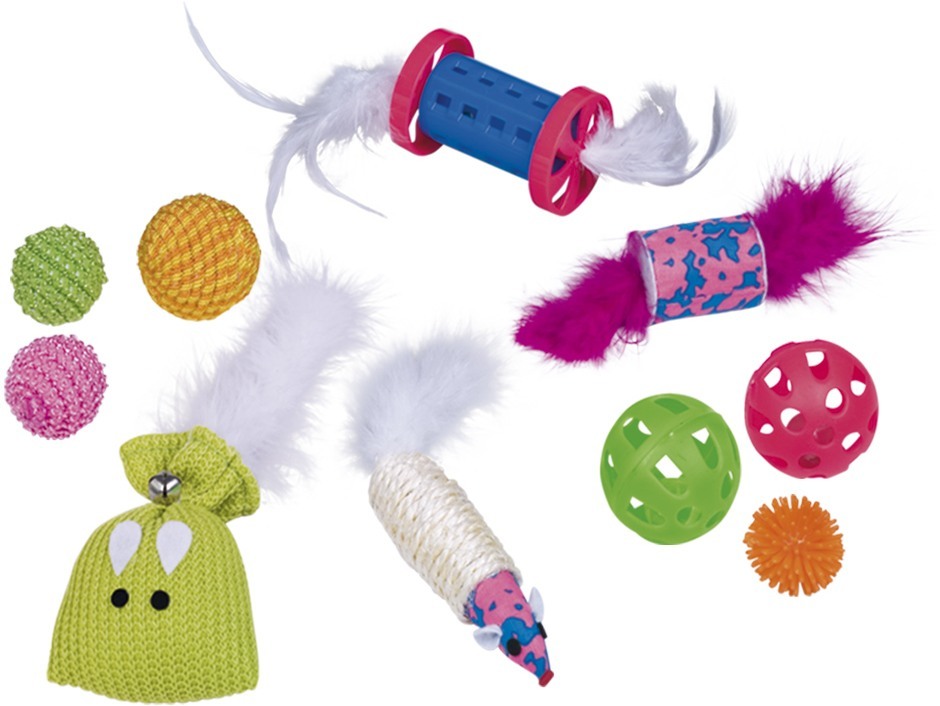Startovní balíček 10-ti kusů hraček pro kočky. Vhodné jako výbava pro nové koťátko. Balení obsahuje: 2x válečky s peřím a catnipem, velikost 7,5cm (z toho váleček 4,5cm) 1x textilní pytlík 10cm s peřím a catnipem 1x sisalová myška s peřím a catnipem, celková velikost 12cm 3x textilní míčky ø 4...
