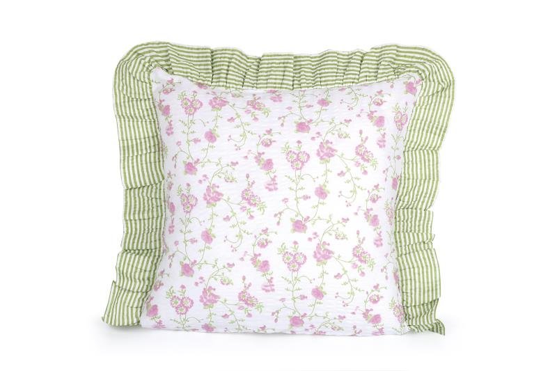 Polštářek s volánem krep na zip - růžovozelný květ se zeleným proužkem - 40x40 cm