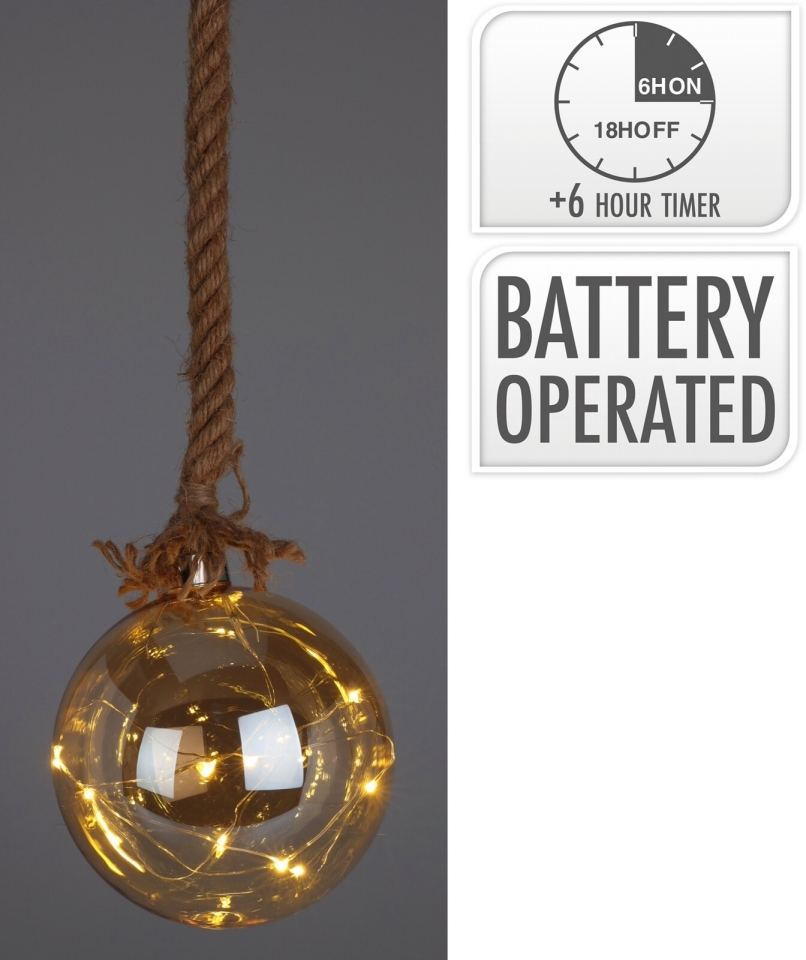 Skleněná koule s 10 LED diodami teplé bílé barvy. Koule je zavěšená na jutovém provazu. Napájení 2x AA tužkovými bateriemi (nejsou součástí výrobku). Časovač 6/18 h.Materiál: sklo, jutový provazRozměry:průměr 12 cmdélka provazu 80 cm prečítať celé