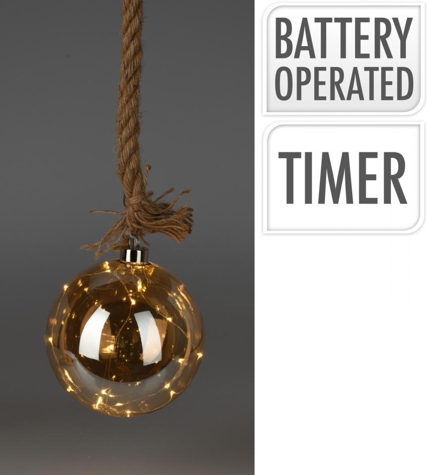 Skleněná koule s 15 LED diodami teplé bílé barvy. Koule je zavěšená na jutovém provazu. Napájení 2x AA tužkovými bateriemi (nejsou součástí výrobku). Časovač 6/18 h.Materiál: sklo, jutový provazRozměry:průměr 15 cmdélka provazu 80 cm prečítať celé