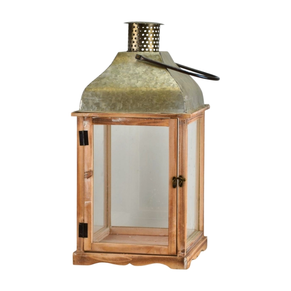 Dřevěná lucerna v přírodním odstínu hnědé s kovovou střechou