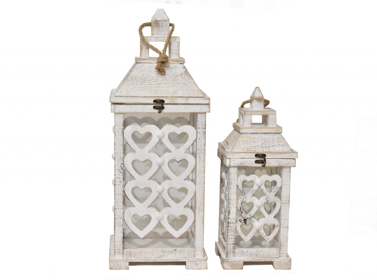 Sada 2 ks dřevěných luceren se srdíčkem. Lucerny se otevírají přes střechu. Materiál: dřevo, sklo Rozměry: velká výška  63,5 cm šířka 23,5 cm hloubka 23,5 cm malá výška 44,5 cm šířka 17 cm hloubka 17 cm prečítať celé