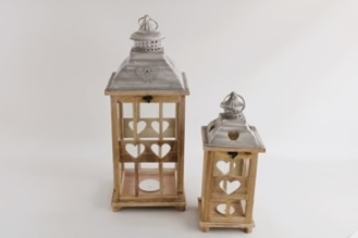 Dřevěná lucerna se srdíčky, přírodní, sada 2 ks