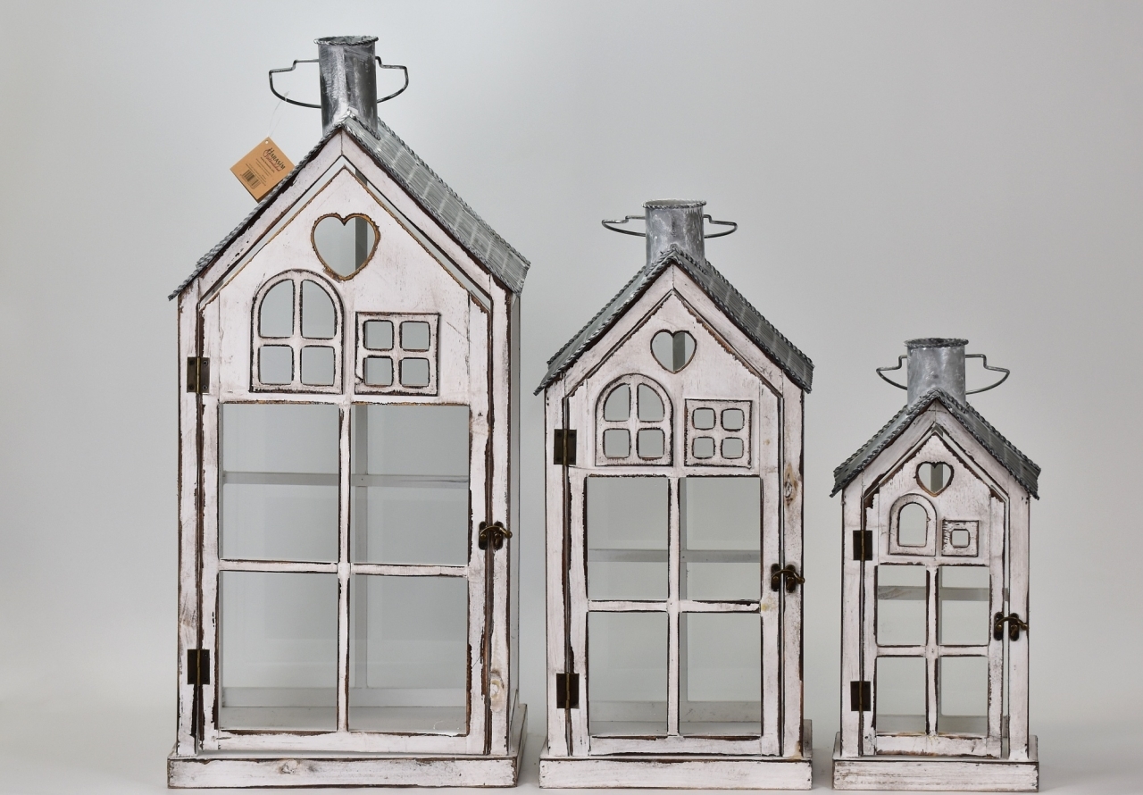 Dřevěná lucerna domek sada 3 ks, bílá s patinou