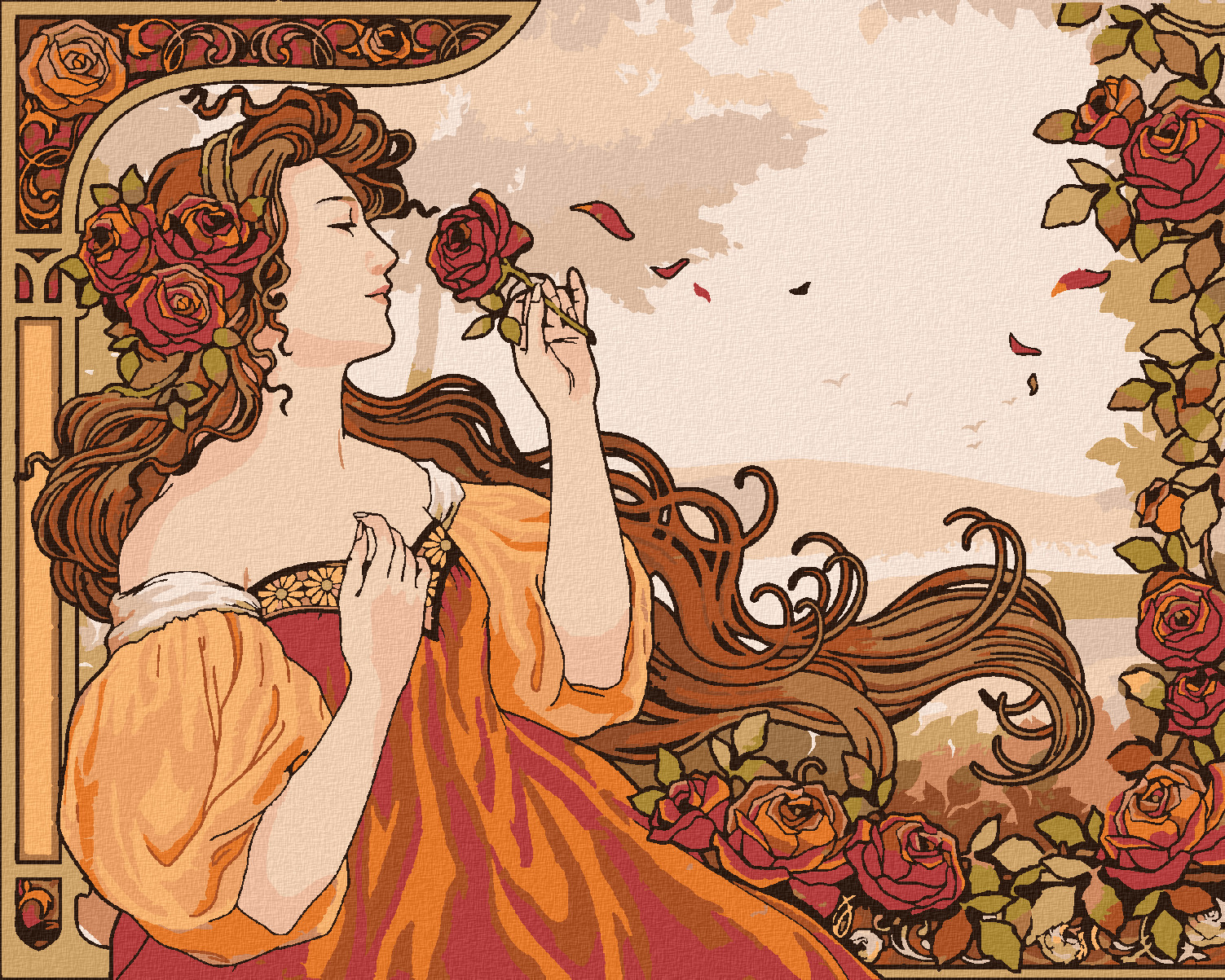 Malování podle čísel - REPRODUKCE ŽENA A RŮŽE (ALFONS MUCHA) - 80x100 cm, bez rámu a bez vypnutí plátna