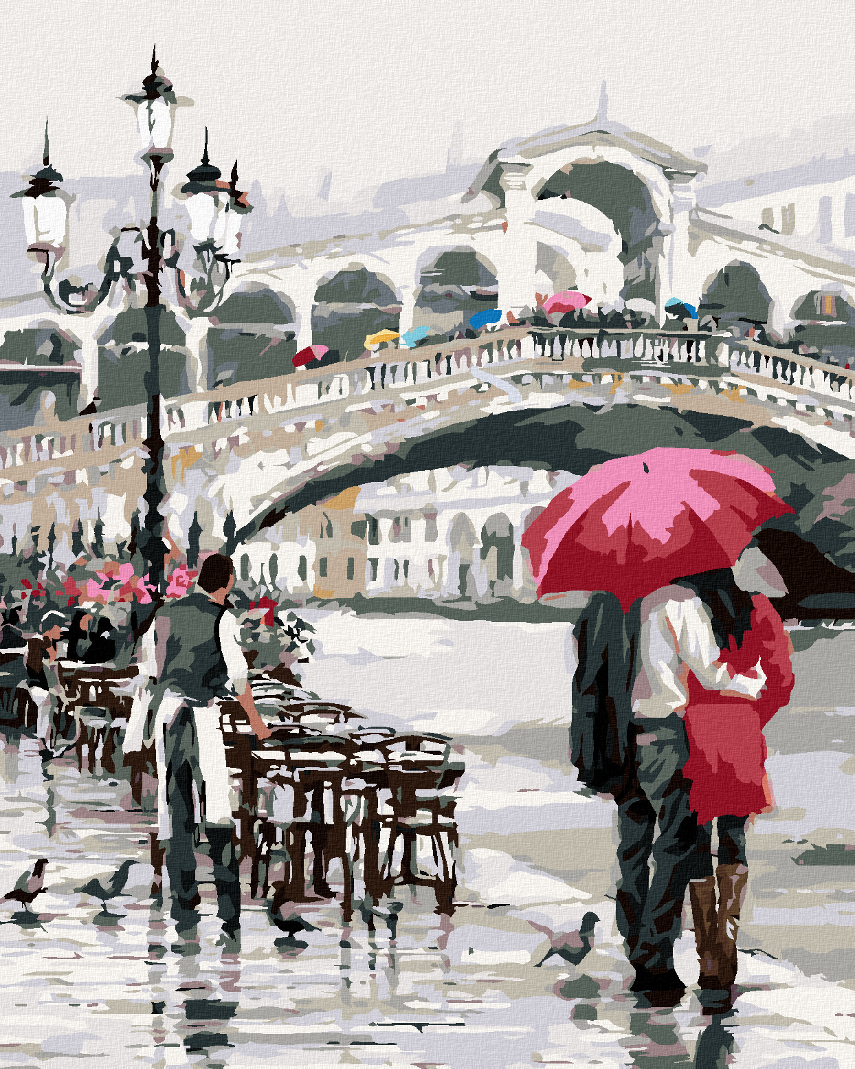 Malování podle čísel - MILENCI S DEŠTNÍKEM U MOSTU (RICHARD MACNEIL) - 80x100 cm, vypnuté plátno na rám