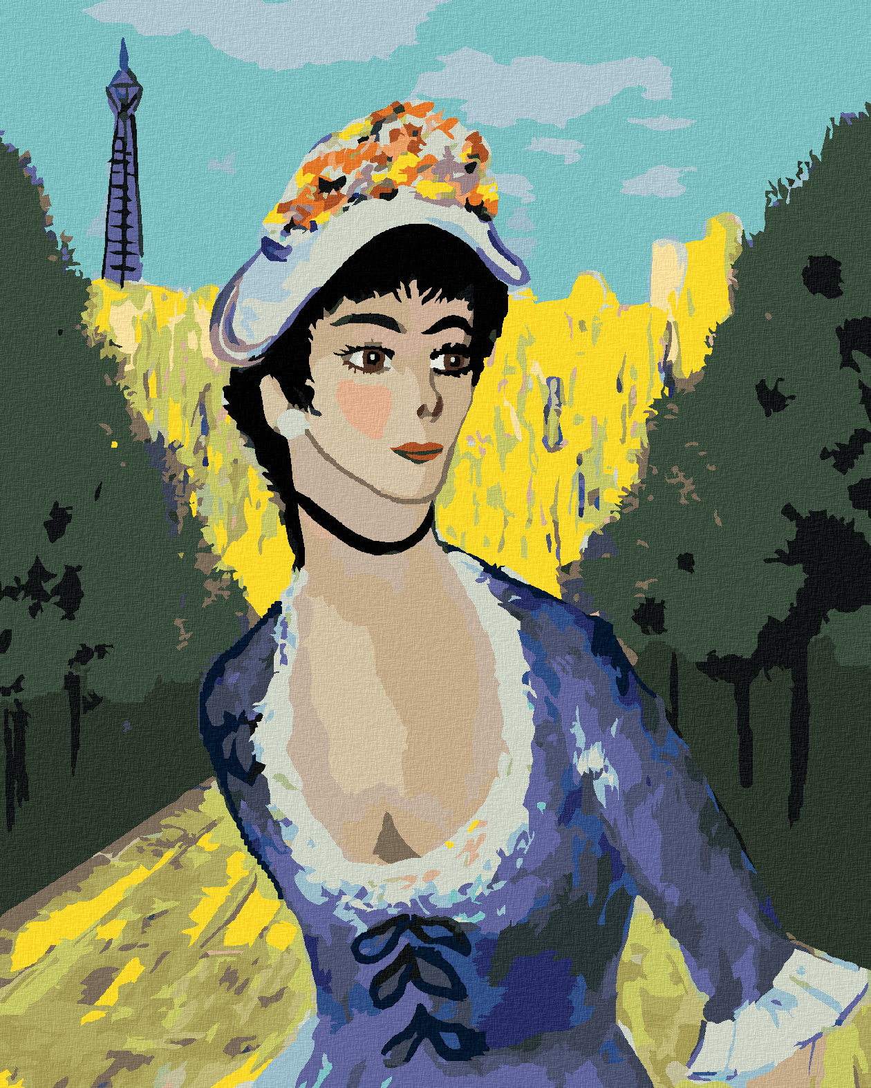 Malování podle čísel - ŽENA V PARKU PŘED EIFFELOVOU VĚŽÍ - 80x100 cm, vypnuté plátno na rám